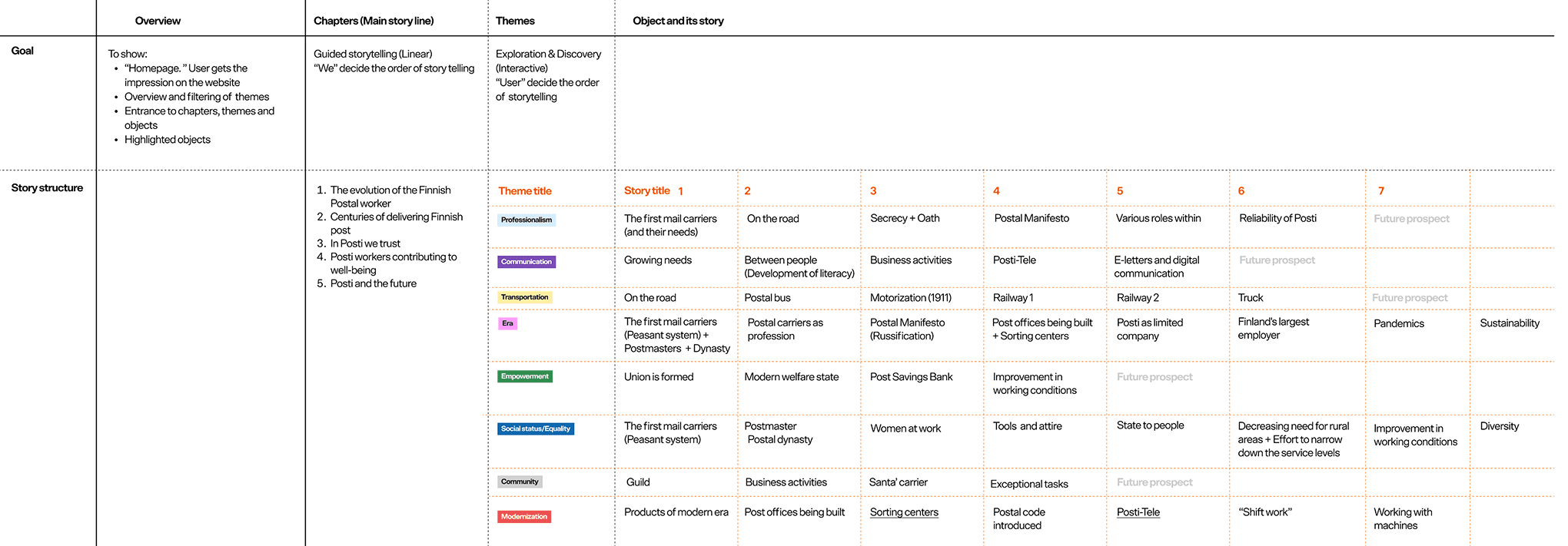 In the collection of different pieces of stories, the client initially drafted five chapters to structure them — five storylines that narrates past, present and the future prospective of each. After analysing their content in depth, we noticed recurring themes and an opportunity to group them separately to offer another type of experience. While the main storyline with chapters was linear and guided, themes allow visitors to explore and discover the stories on their own.